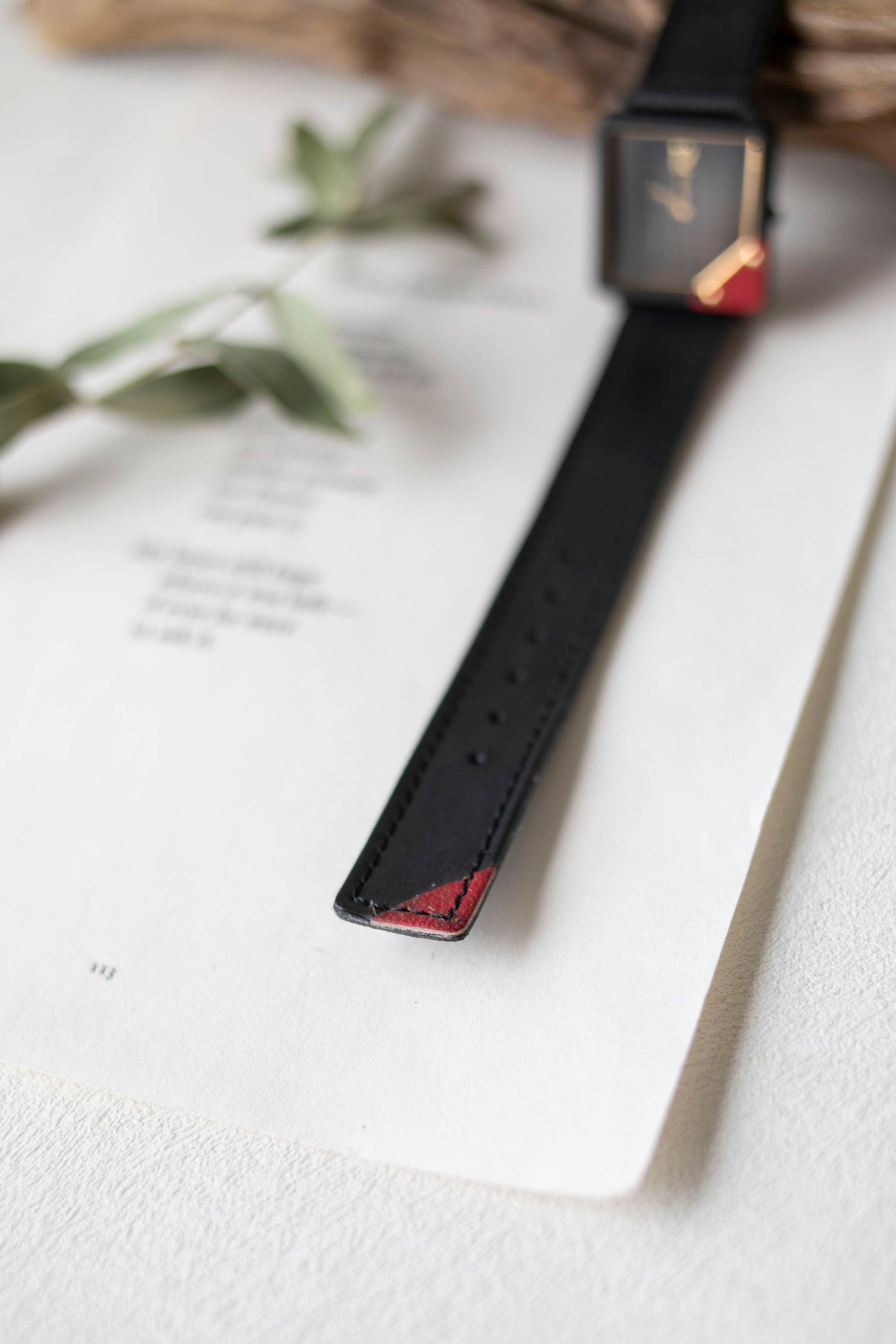 - Housed in a black square frame with red accent